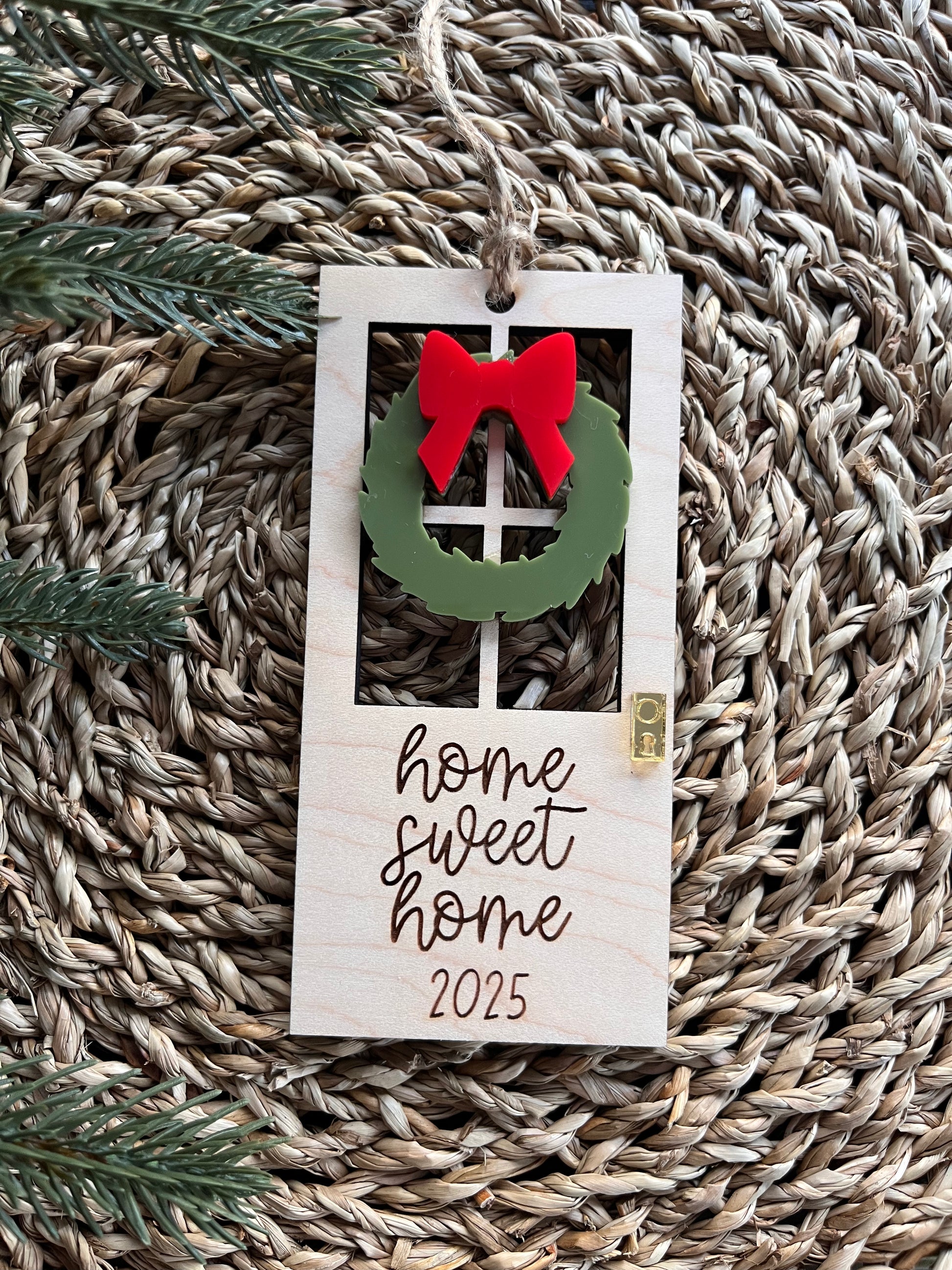 New Home Ornament, laser engraved with "Home Sweet Home 2025" with acrylic wreath and bow