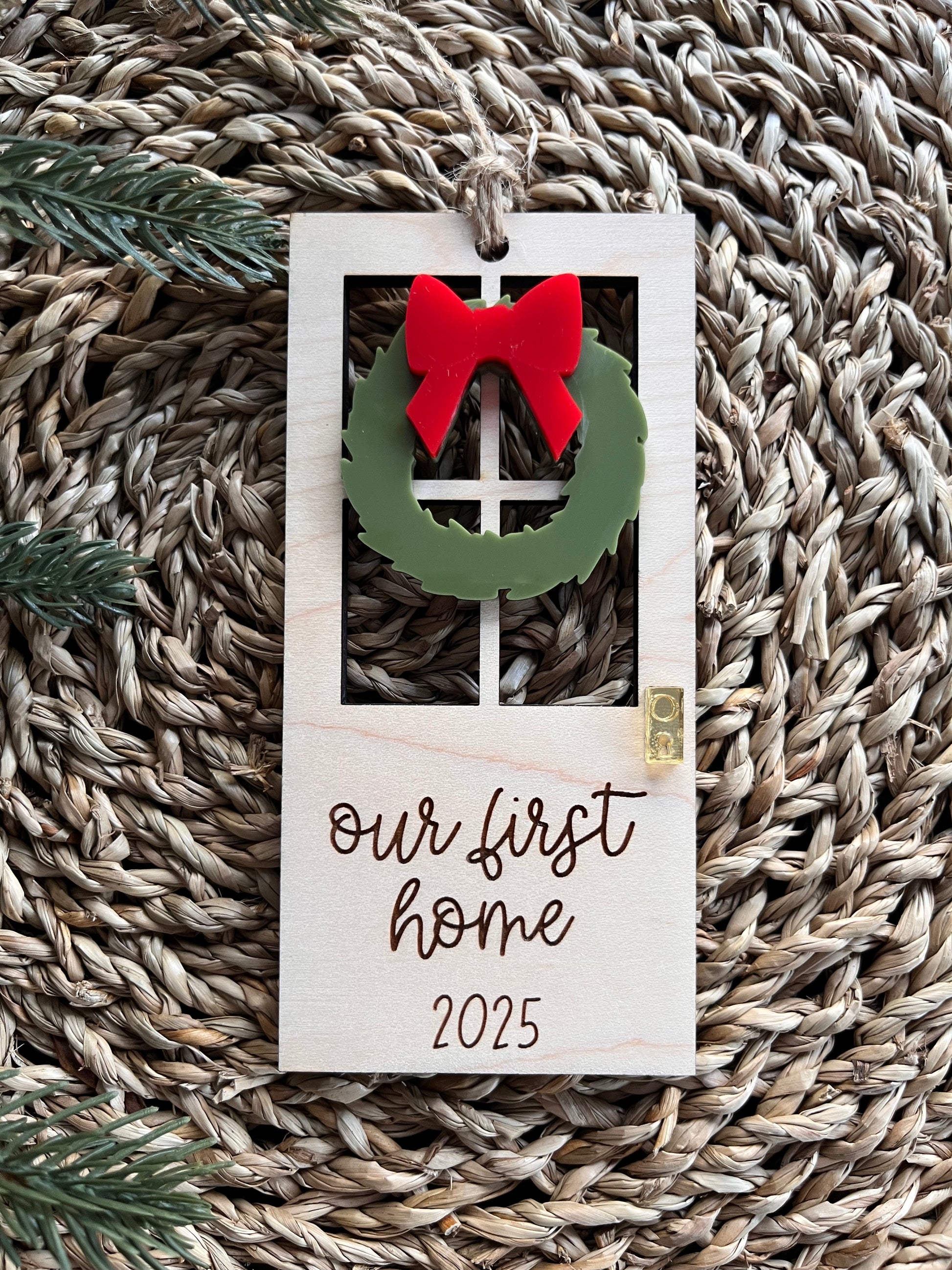 New Home Ornament, laser engraved with "Our First Home" with acrylic wreath and bow